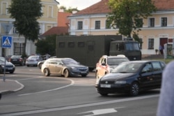 Побач стаяць два аўтазакі і мікрааўтобус з таніраванымі вокнамі, шмат людзей у цывільным і ў масках.
