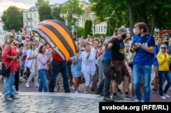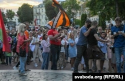 Сотні пратэстоўцаў зь бел-чырвона-белымі сьцягамі прыйшлі ў парк Жылібера. Гарадзенцы водзяць карагод каля Вечнага Агню, пляскаюць у ладкі, скандуюць «Верым, можам, пераможам», «Сыходзь», «Не баімся».