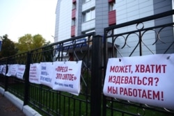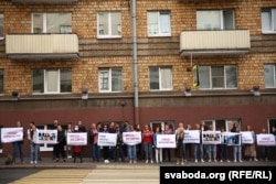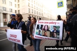 «Прэса — гэта сьвятое. Юры Караеў», «Свабоду журналістам», «Рабілі сваю працу — апынуліся на Акрэсьціна» — з такімі плякатамі прысутныя журналісты Tut.by, «Онлайнеру», «БелаПАН», «Нашай нівы» і іншых мэдыя сталі насупраць будынку МУС.