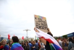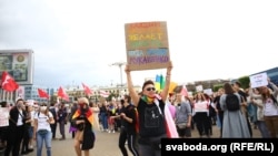 На Камароўцы таксама зьявілася калёна з прыкладна дзесяці ЛГБТ-актывістаў, яны далучыліся да ўдзельніц жаночага маршу. У іх вясёлкавыя сьцягі, банэры. На адным напісана: «Каждый охотник желает знать, когда посадят Лукашенко».