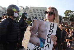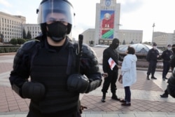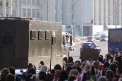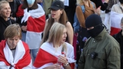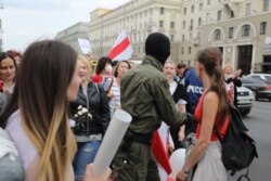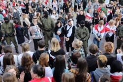 17.32 З боку Дома ўраду зьявіўся ланцуг людзей у камуфляжы ў балаклавах, яны перакрылі падыход да Дома ўраду. Затрыманьняў няма. Жанчыны працягваюць вадзіць карагод.