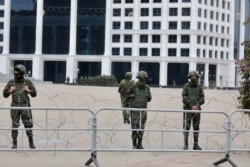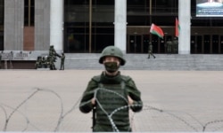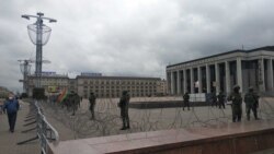 Кастрычніцкую плошчу гэтым разам абгарадзілі калючым дротам і міліцэйскімі загарадкамі, а ня плястыкавымі адбойнікамі, як мінулай нядзеляй. Уздоўж агароджы паставілі вайскоўцаў у масках
