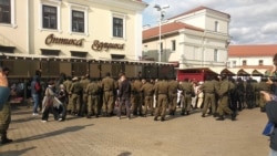 Хутка на плошчу Свабоды пад’ехалі мікрааўтобусы з танаванымі шыбамі, пачаліся затрыманьні. Натоўп выгукае «Пайшлі прэч!». Жанчыны становяцца ў счэпкі, спрабуюць абараніць адна адну. Затрыманьні жорсткія.