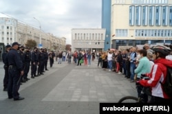 Прыхільнікі пераменаў скандавалі ў адказ: «Ганьба», «Гэта наш горад», «Фашысты». Напружанасьць спала, калі частка міліцыянтаў сышла.