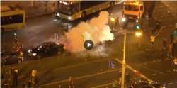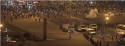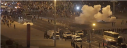 А на самым скрыжаваньні стаяў АМАП са шчытамі. І, калі шчыты рассоўваліся пасярэдзіне, адтуль выбягалі іншыя амапаўцы, ужо ня так моцна экіпаваныя, і за тры мэтры ад сваёй шчытавой загароды раскладвалі свае ці то гранаты, ці то фаервэркі. Тыя шумелі, круціліся, сьвяціліся і потым выбухалі. І была такая дымавуха. Дыму рабілася ўсё больш і больш. Людзі скандавалі, і я ня бачыў, каб нехта там кідаўся камянямі, выкочваў сьметніцы. То бок ніякіх барыкад з боку мітынгоўцаў не было.
