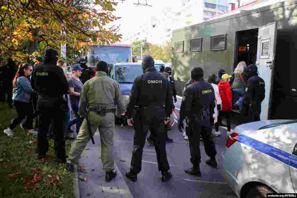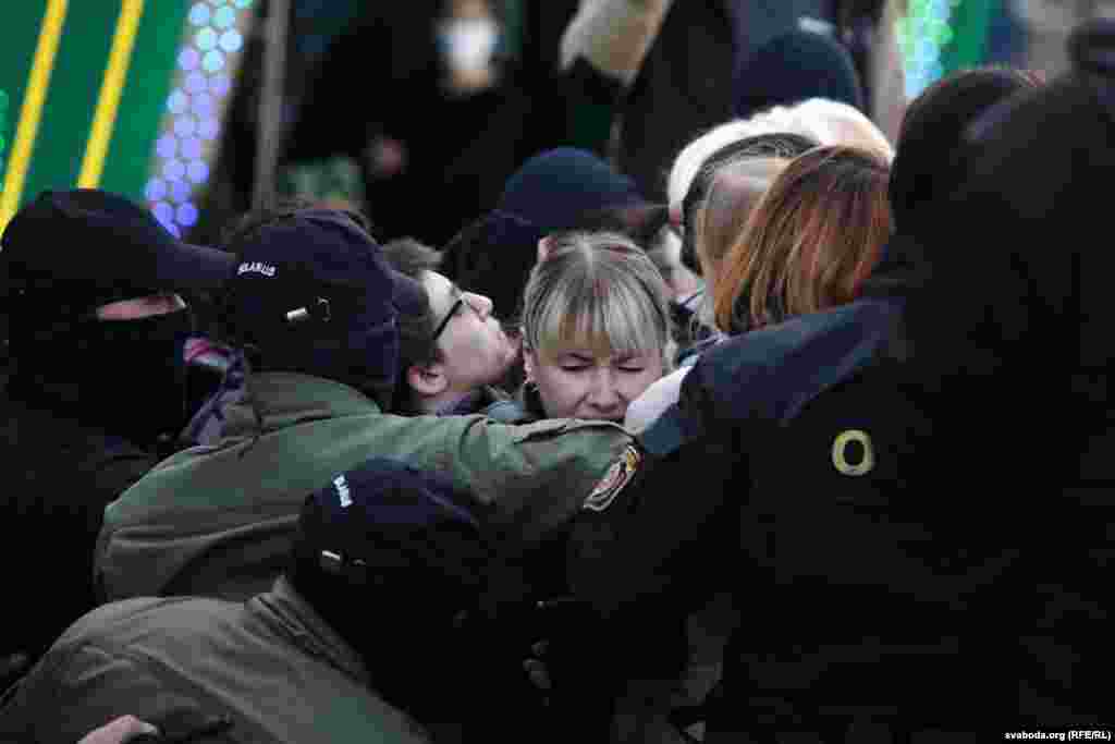 Каля забаўляльнага цэнтру «Айсбэрг» на скрыжаваньні Сурганава і Якуба Коласа сілавікі ў балаклавах разьбілі калёну жанчын на некалькі частак, абкружылі ўдзельніц