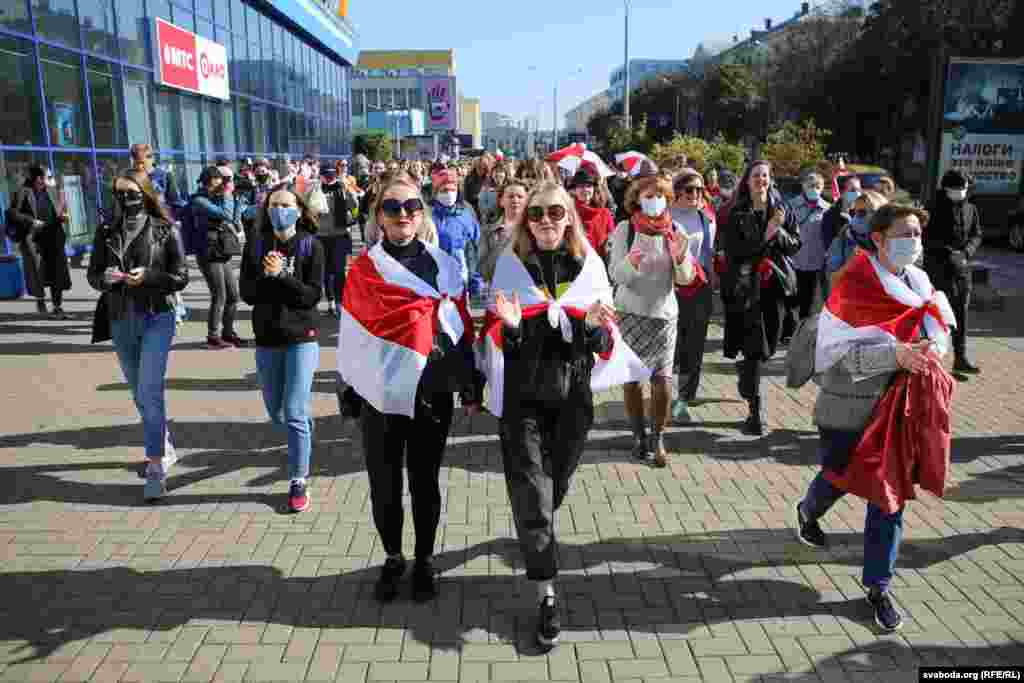 Жанчыны выстраіліся ў шэрагі і арганізавана рушылі ў бок вуліцы Багдановіча