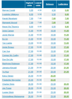 Што яшчэ? У першай дваццатцы NicerOdds апынуліся яшчэ два прозьвішчы пісьменьнікаў, якіх я чытаў і быў бы ня супраць, калі б іх уганаравалі Нобэлеўскай прэміяй. Гэта Кормак Маккарты (нар. 1933) — па-мойму, найлепшы з жывых пісьменьнікаў ЗША. І нарвэжац Юн Фосэ (нар. 1959) — драматург і празаік, прадстаўнік, так бы мовіць, «мінімалістычнага стылю» ў драматургіі і прозе. Ах, і яшчэ Эдна О’Браен (нар. 1930), ірляндзкая раманістка! Некалі, яшчэ ў сярэдняй школе, я прачытаў яе першы раман, «The Country Girls» (1960, «Дзяўчаты зь вёскі»). Але ён мне настолькі спадабаўся, што помню яго і да сёньня.