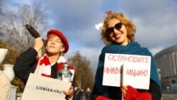 Каля ГУМу калёна людзей з інваліднасьцю паварочвае на вуліцу Леніна, бо ўдзельнікі ня могуць спусьціцца ў пераход. Калёна жанчын рушыць далей па праспэкту.
