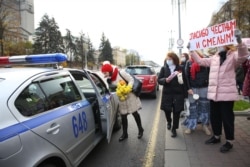 Яны стаяць без сьцягоў, плякатаў, лёзунгаў. Міліцыянты падыходзяць і размаўляюць зь імі. З аўтазаку гучыць музыка і папярэджаньні па-беларуску.
