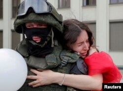 І яшчэ фота Васіля Фядосенкі. Удзельніца пратэсту абдымае супрацоўніка ўнутраных войскаў МУС Беларусі, які стаіць на варце падчас дэманстрацыі апазыцыі ля Дома ўраду на плошчы Незалежнасьці ў Менску 14 жніўня.