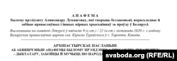 Уладаю, дадзенаю нам ад Бога, адлучаем ад Сьвятое Праваслаўнае Царквы і абвяшчаем анафему былому прэзыдэнту Аляксандру Лукашэнку, які хоць і носіць імя хрысьціянскае і толькі па нараджэньню належыць да Царквы Праваслаўнае, забараняем прыступаць яму да Тайнаў Хрыстовых, успамінаць яго ў праваслаўных набажэнствах і малітвах да поўнага ягонага пакаяньня перад Царквою і народам Беларускім. Заклікаем тых, хто яшчэ служыць ягонай сатанінскай уладзе, не выконваць злачынныя загады, бо інакш чакаюць вас пракляцьце нашчадкаў у жыцьці зямным і пекла — у жыцьці нябесным...»