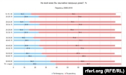Прыкладна такая ж дынаміка назіралася і ў адказах пра мову хатняга ўжытку — у адказах на пытаньне перапісаў «На якой мове Вы звычайна гаворыце дома?». Летась беларускую мовай хатняга ўжытку назвалі 26%, у 2009 годзе — 23%, у 1999-м — 36,7%.