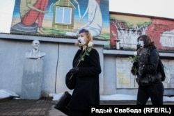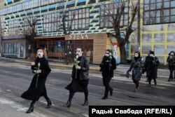 Жанчыны ў чорных строях моўчкі прайшліся па вуліцы Кастрычніцкай. У руках яны трымалі белыя ружы, а нанесеныя паўзьверх мэдычных масак крыжы імітавалі залеплены рот і адначасова забарону на свабоду слова.