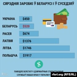 Пяць гадоў таму беларускія заробкі істотна абганялі заробкі ва Ўкраіне і Малдове (доўгі час лічылася самай беднай краінай Эўропы). У 2016-м параўнаньне выглядала наступным чынам:
