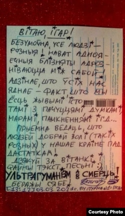 «Я ў сваім бязглуздым ультрагуманізьме максымальна адэкватны. Як там было ў адной з апошніх размоваў нашых — кожны мусіць быць на сваім месцы» (паштовы штамп ад 17 лістапада 2020 году).