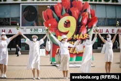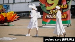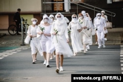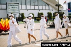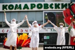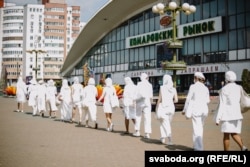 Жанчыны ў белым адзеньні і белымі кветкамі ў руках выйшлі да Камароўскага рынку ў Менску. Роўна дзевяць месяцаў таму жанчыны ў белым упершыню масава выйшлі на пратэст супраць гвалту сілавікоў.