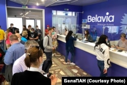 У Менску ў касах нацыянальнай авіякампаніі «Белавія» ўтварыліся чэргі на вяртаньне квіткоў з-за скасаваньня рэйсаў у краіны Эўразьвязу.