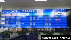 Cancelled — першае, што кідаецца ў вочы на вялікім сінім табло вылетаў у вялікай залі аэрапорта. Такія надпісы чырвонымі літарамі, напераменку па-ангельску, па-беларуску і па-кітайску, высьвечваюцца насупраць нумароў рэйсаў у Варшаву і Амстэрдам. Калі адлёты зьмяняюцца назвамі блізкіх прылётаў — тыя ж чырвоныя літары высьвечваюцца насупраць Мілана і, нечакана, Калінінграда. Расейскі анкляў пацярпеў праз закрыцьцё для беларускіх самалётаў паветранай прасторы Польшчы і Літвы. Даляцець туды зь Менску безь перасадак можна цяпер толькі кругам праз Латвію і Балтыйскае мора.