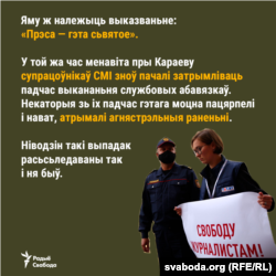 У той жа час менавіта пры Караеву супрацоўнікаў недзяржаўных і замежных СМІ зноў пачалі затрымліваць падчас выкананьня службовых абавязкаў. Некаторыя зь іх падчас гэтага моцна пацярпелі і нават, як журналістка «Нашай нівы» Натальля Лубнеўская, атрымалі агнястрэльныя раненьні. Ніводзін такі выпадак расьсьледаваны так і ня быў.