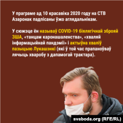 У прысьвечаным пандэміі каранавірусу сюжэце Юры Азаронак актыўна хваліў пазыцыю Аляксандра Лукашэнкі (ён у той час прапаноўваў лячыць хваробу з дапамогай трактара. — РС), а Беларусь называў ці не адзінай дзяржавай, якая супрацьстаіць сусьветнай эпідэмічнай змове.