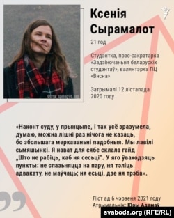 • Студэнтка, прэс-сакратарка «Задзіночаньня беларускіх студэнтаў», валянтэрка ПЦ «Вясна»