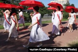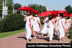 Чырвоная стужка на адзеньні жанчын сымбалізуе кроў з сэрца, чорны галаўны ўбор — жалоба аб загінулых, белыя сукенкі і парасон — знак чысьціні, лепшай будучыні, расказалі ўдзельніцы акцыі.