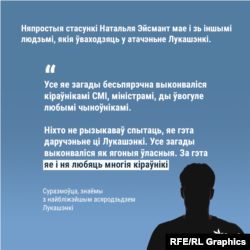 «Спачатку (Натальля Эйсмант. — РС) была нясьмелай ці рабіла выгляд, але даволі хутка асвоілася і стала літаральна часткай прэзыдэнцкай сям’і, — цытавала восеньню 2020 году расейскае выданьне „Медуза“ суразмоўцу, знаёмага з найбліжэйшым асяродзьдзем Лукашэнкі. — Усе яе загады бесьпярэчна выконваліся кіраўнікамі СМІ, міністрамі, ды ўвогуле любымі чыноўнікамі. Ніхто не рызыкаваў спытаць, яе гэта даручэньне ці Лукашэнкі. Усе загады выконваліся як ягоныя ўласныя. За гэта яе і ня любяць многія кіраўнікі».
