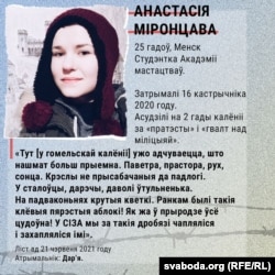 - Затрымалі 16 кастрычніка 2020 году. Асудзілі на 2 гады калёніі за «пратэсты» і «гвалт над міліцыяй».