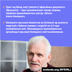 У выніку сьледзтва і судовага працэсу Бяляцкага прызналі вінаватым ва ўхіленьні ад выплаты падаткаў у буйным памеры і асудзілі на 4,5 года пазбаўленьня волі. Міжнародныя праваабарончыя арганізацыі прызналі Бяляцкага палітзьняволеным. Ён быў датэрмінова вызвалены ў чэрвені 2014 году, пасьля таго як Лукашэнка асабіста загадаў праверыць інфармацыю аб кампэнсацыі шкоды, якую нібыта нанесьлі дзяржаве дзеяньні праваабаронцы.