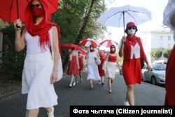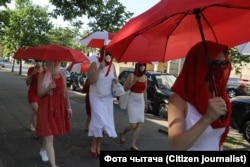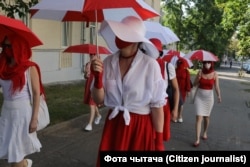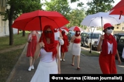 У нядзелю раніцай у цэнтры Менску жанчыны прайшліся з парасонамі колеру беларускага сьцяга. Іх сфатаграфаваў чытач нашага сайту.