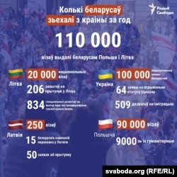 З пачатку году па 31 ліпеня Польшча выдала беларусам 90 тысяч візаў, зь іх 9 тысяч — гэта гуманітарныя візы, зь якімі беларусы могуць працаваць у Польшчы. Са жніўня мінулага году Польшча выдала беларусам 12 тысяч гуманітарных візаў. Такім чынам, толькі ў Літву і Польшчу маглі зьехаць 110 тысяч беларусаў.