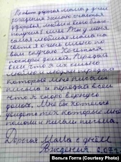 «Прывітаньне, дарагая мама! З днём нараджэньня. Зычу шчасьця, здароўя, любові і дабрабыту ў сям’і. Ты ў мяне самая любімая мама на сьвеце. Я вельмі моцна па вас сумую. Хочацца хутчэй дадому. Перадай усім, што я іх моцна люблю. І людзям перадай, якія мне пісалі лісты. І перадай усім, што я хутка вярнуся дадому. Мне б хацелася ўбачыць тых, хто мне дапамаглі, пісалі лісты», — напісаў палітвязень у адным зь лістоў дахаты.