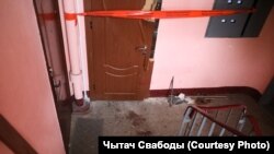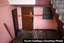 Так сёньня выглядаюць дзьверы кватэры, дзе адбылася страляніна і загінулі 2 чалавекі: ІТ-спэцыяліст Андрэй Зельцар і супрацоўнік КДБ Дзьмітры.