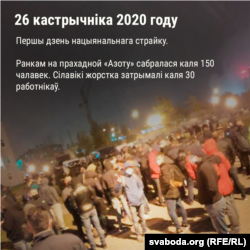 26 кастрычніка 2020 году ў першы дзень нацыянальнага страйку ранкам на прахадной «Азоту» сабралася каля 150 чалавек. Сілавікі жорстка затрымалі каля 30 работнікаў. Некалькі дзён частка супрацоўнікаў адмаўлялася пераймаць свае зьмены. Каля 40 чалавек заявілі аб далучэньні да страйку. Іншыя працавалі замест іх па 36 гадзін запар. Кіраўніцтва запрасіла на працу пэнсіянэраў, стажораў, экс-работнікаў. На замену страйкоўцам прыехалі работнікі зь іншых хімічных заводаў. Вытворчасьць не спынілі. Больш за 10 чалавек пасьля гэтага звольнілі. Яны безвынікова спрабавалі аднавіцца на працы праз суд.