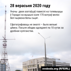 У ноч на 28 верасьня 2020 году двое азотаўцаў, Сяргей Шэлест і Андрэй Пагерыла, павесілі на тэлевышцы ў Горадні на вышыні каля 170 мэтраў вялікі бел-чырвона-белы сьцяг. Іх адразу затрымалі і далі па 10 сутак арышту. Цяпер яны сярод затрыманых у «Амэрыканцы». Невядомыя неаднойчы вывешвалі нацыянальны сьцяг і над «Азотам». Каля заводу зьяўляліся плякаты з падтрымкай рабочых.