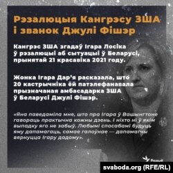«З Джулі Фішэр мы размаўлялі каля 20 хвілін, — кажа Дар’я. — Я расказала, што адбываецца зь Ігарам. Яна паведаміла мне, што пра Ігара ў Вашынгтоне гавораць практычна кожны дзень. І ніхто ні ў якім выпадку яго не забыў. Любымі спосабамі будуць яму дапамагаць, самае галоўнае — дапамагчы вярнуцца Ігару дадому. Джулі таксама сказала, што мы можам быць на сувязі ў любы момант. Калі раптам нешта здарыцца, альбо я буду ведаць пра тое, што зь Ігарам нешта адбывалася, заўсёды магу адразу пра гэта ёй паведаміць».