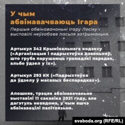Першыя два артыкулы абвінавачаньня, выстаўленага Ігару Лосіку, прадугледжваюць пакараньне ў выглядзе пазбаўленьня волі да 4 і да 8 гадоў адпаведна.