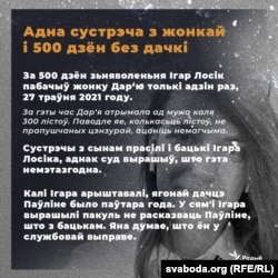 «Паўліна пытае, дзе тата і калі яна зможа пайсьці зь ім гуляць у парк, — расказвае Дар’я Лосік. — Калі ён павядзе яе ў краму, каб набыць ёй сюрпрыз. Хоць ёй было паўтара года, калі забралі Ігара, але яна памятае яго кубак, яго вопратку. Гэта ўсё вельмі сумна, папраўдзе».