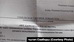 «Калі ехала зараз з Украіны, то гэта, відаць, быў самы „лайтовы“ надгляд, без імпэту, — расказвае дзяўчына. — Грошай таксама не шукалі пільна, спыталі толькі, колькі я вязу. Запісалі суму з маіх словаў. Фотаапарат паглядзелі, аб’ектывы. Усё ў акт агляду занесьлі, напісалі, што рэчы карыстаныя».