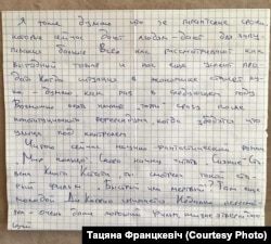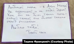 «Саша малайчына, трымаецца бадзёра і мяне стараецца падтрымаць празь лісты. У апошні час лісты пачалі затрымліваць, ужо тры тыдні няма. А так Саша не маркоціцца, нягледзячы на тое, што мае праблемы са здароўем: у яго адна нырка. Як і раней, Саша пісаў у лістах, каб я не хвалявалася, што гэта не назаўжды і што за чорнай ноччу заўсёды прыходзіць сьвітанак».