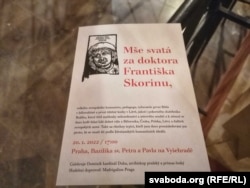 Службы дзеля ўшанаваньня беларускага першадрукара адбыліся сёньня ня толькі ў Празе, дзе Францішак Скарына пражыў частку свайго жыцьця, але і ў іншых гарадах Эўропы і Беларусі: Менску і Полацку, Вільні, Варшаве і італьянскай Падуі, дзе ён вывучаў мэдыцыну.