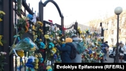 Жыхары Менску прыносяць да пасольства Ўкраіны ў Беларусі кветкі.