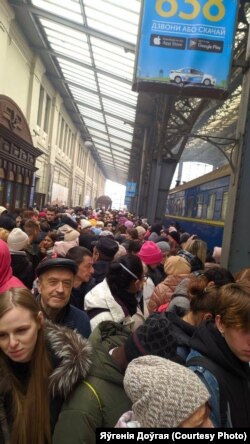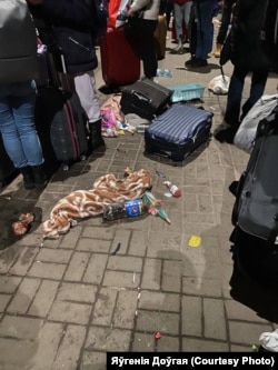 «На вакзале было поўнае адчуваньне вайны. Было настолькі трывожна, здавалася, што ў цябе прыляціць снарад. Усе людзі сварыліся, штурхаліся. Як падышоў цягнік, пачалася жудасная цісканіна, людзі моцна плакалі, крычалі, кідалі свае валізкі на пэроне, на рэйкі. Дзеці падалі, па іх тапталіся людзі. Яшчэ падчас усяго гэтага страшна страціць рэчы, бо ўсё крадуць, зрываюць зь цябе торбы, прыгожыя, яркія валізкі, куды людзі ўклалі сваё жыцьцё, кідалі на плятформе і на рэйках. Бралі толькі самае дарагое. Пасьпявалі толькі пераноску з катом ці сабакам узяць і заскочыць у вагон», — апавядае Яўгенія.