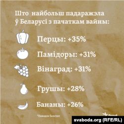 Кіляграм перцаў у лютым каштаваў 9,76 рубля за кіляграм, а ў сакавіку — ужо 15,13 рубля за кіляграм. Рост 35%.
