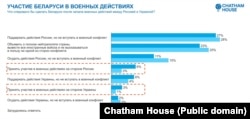 Грамадзкай думцы ўласьцівыя супярэчнасьці. Баяцца ўцягваньня ў вайну 57%; лічаць, што Беларусь уцягнуць у вайну, — 11%. Беларусам у адказах апытаньняў уласьцівая гатоўнасьць зваліць адказнасьць на Расею, маўляў, мы не вінаватыя, гэта ўсё яны. І такія падыходы ёсьць на розных баках палітычнага спэктру. Прыхільнікі Лукашэнкі кажуць: ваюе Расея, мы тут ні пры чым, стаім убаку, курым. У прыхільнікаў пратэсту ёсьць адчуваньне, што ў гэты вір нас цягне Расея».