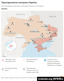 - Расейскія войскі атакавалі ў тым ліку з тэрыторыі Беларусі, выкарыстоўваючы лётнішчы, базы і дарогі. Прадстаўнікі рэжыму Лукашэнкі апраўдваюць вайну, яго праціўнікі лічаць тэрыторыю Беларусі акупаванай, многія заклікаюць да супраціву расейскім захопнікам. Насуперак заявам Пуціна пра атакі выключна на вайсковыя аб’екты, расейцы пачалі бамбіць школы, дзіцячыя садкі і жылыя кварталы ўкраінскіх гарадоў.