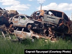 Недалёка ад аэрапорту — «могілкі» зьнішчаных аўта, якія, напэўна сабралі з вуліц ня толькі Гастомеля, але і суседняй Бучы. Дзясяткі машын, у якіх людзей расстралялі толькі таму, што яны ўкраінцы.