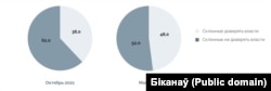 За 7 месяцаў, якія прайшлі паміж апытаньнямі, доля рэспандэнтаў, якія ў той ці іншай ступені давяраюць уладзе (зацятыя прыхільнікі ўлады + схільныя давяраць уладзе), павялічылася на 10 адсоткавых пунктаў і склала амаль палову.