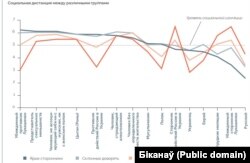 На графіку відаць, што палітычныя антыподы — зацятыя праціўнікі і зацятыя прыхільнікі ўлады — ставяцца адны да адных горш, чым да каго б там ні было іншага. Іх узаемныя ацэнкі — паміж 6 і 7, гэта значыць паміж «гатовыя прыняць як турыста ў Беларусі» і «ні ў якім выглядзе не хацеў бы бачыць іх у Беларусі».